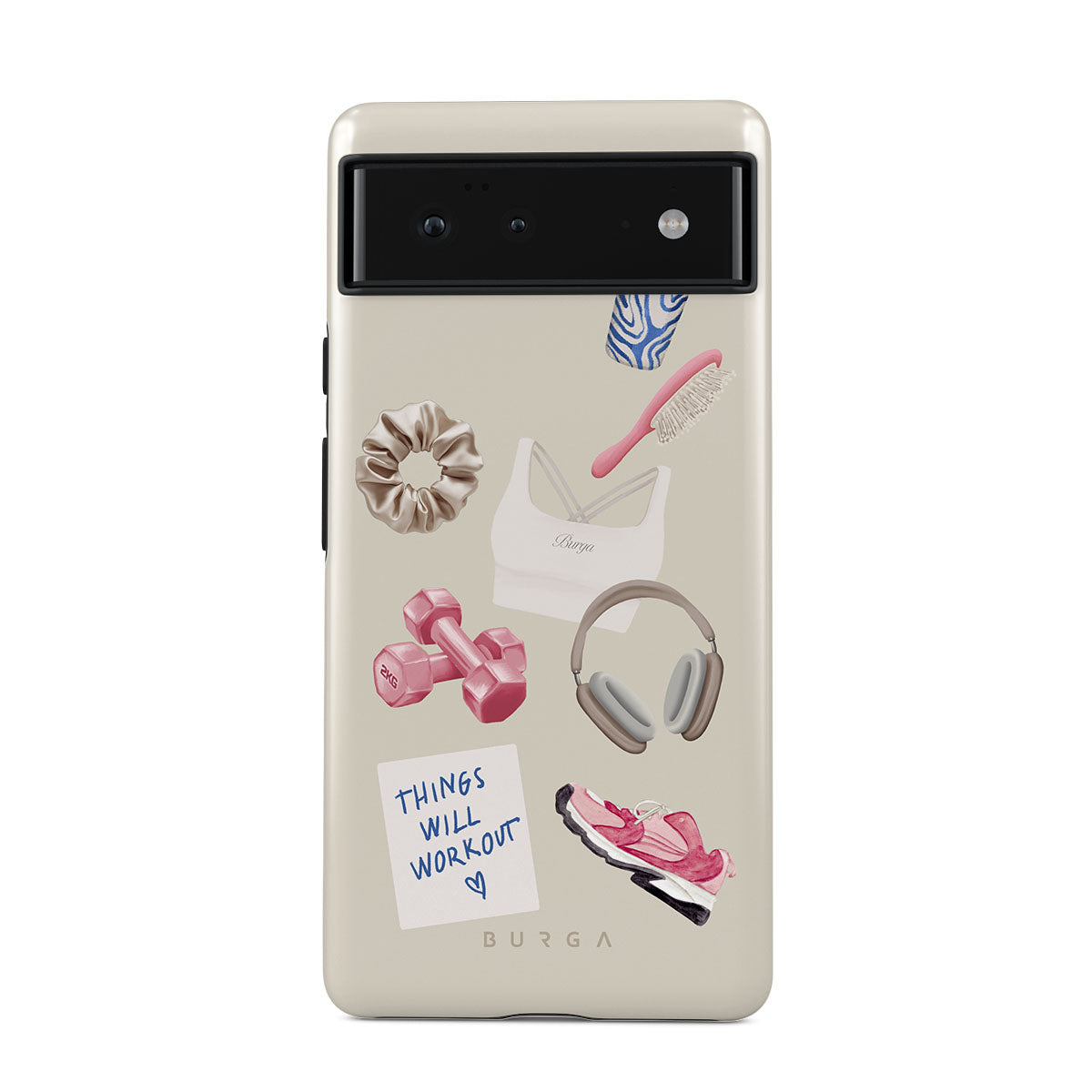 Kenmerken van dit design: dumbbells, koptelefoon, drinkbeker, haarborstel, roze sneakers, sport-bh, Crunchie-reep, sticky note "Things Will Work Out".