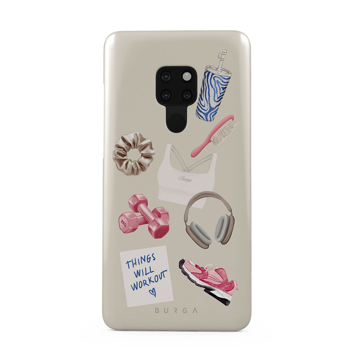 Kenmerken van dit design: dumbbells, koptelefoon, drinkbeker, haarborstel, roze sneakers, sport-bh, Crunchie-reep, sticky note "Things Will Work Out".