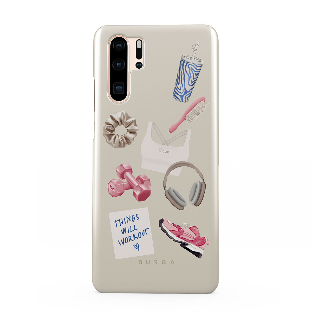 Kenmerken van dit design: dumbbells, koptelefoon, drinkbeker, haarborstel, roze sneakers, sport-bh, Crunchie-reep, sticky note "Things Will Work Out".