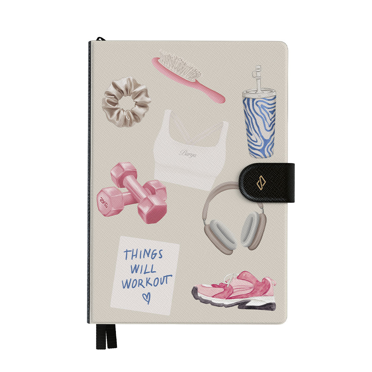 Kenmerken van dit design: dumbbells, koptelefoon, drinkbeker, haarborstel, roze sneakers, sport-bh, Crunchie-reep, sticky note "Things Will Work Out".