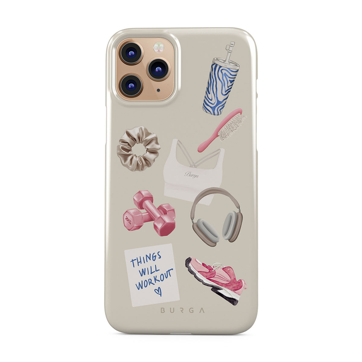 Kenmerken van dit design: dumbbells, koptelefoon, drinkbeker, haarborstel, roze sneakers, sport-bh, Crunchie-reep, sticky note "Things Will Work Out"