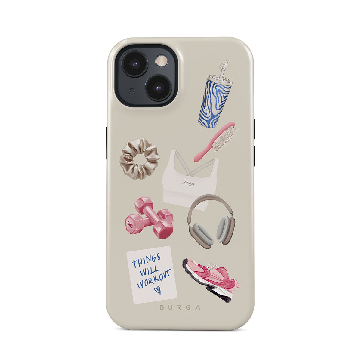 Kenmerken van dit design: dumbbells, koptelefoon, drinkbeker, haarborstel, roze sneakers, sport-bh, Crunchie-reep, sticky note "Things Will Work Out".