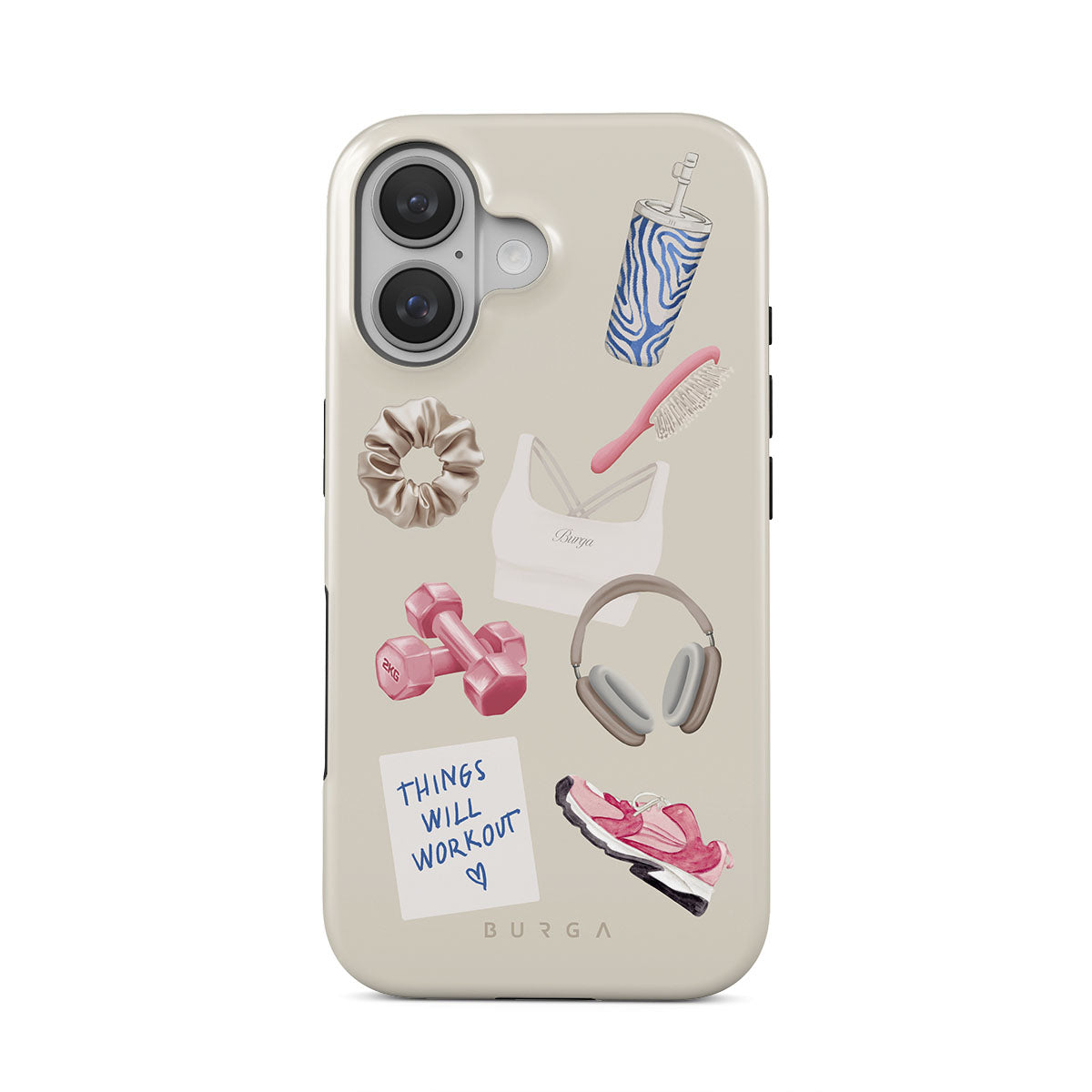 Kenmerken van dit design: dumbbells, koptelefoon, drinkbeker, haarborstel, roze sneakers, sport-bh, Crunchie-reep, sticky note "Things Will Work Out".