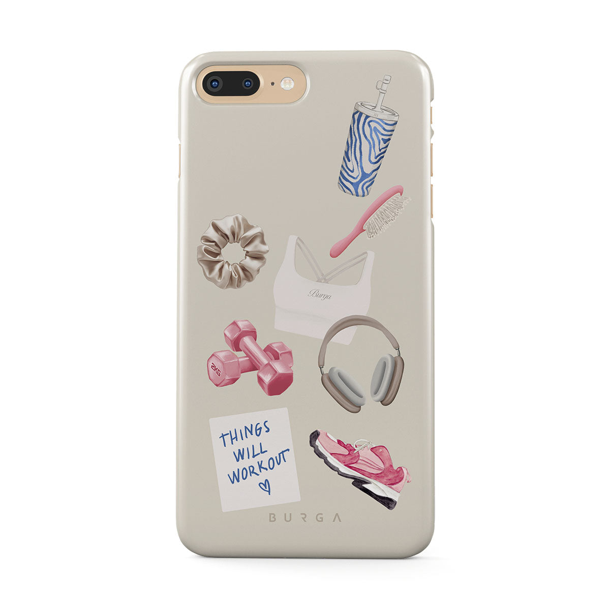 Kenmerken van dit design: dumbbells, koptelefoon, drinkbeker, haarborstel, roze sneakers, sport-bh, Crunchie-reep, sticky note "Things Will Work Out".