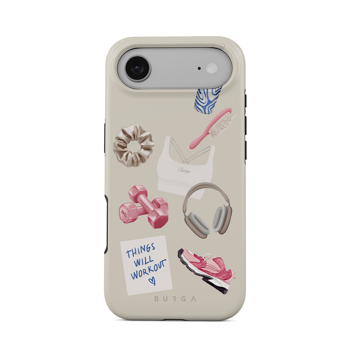Kenmerken van dit design: dumbbells, koptelefoon, drinkbeker, haarborstel, roze sneakers, sport-bh, Crunchie-reep, sticky note "Things Will Work Out".