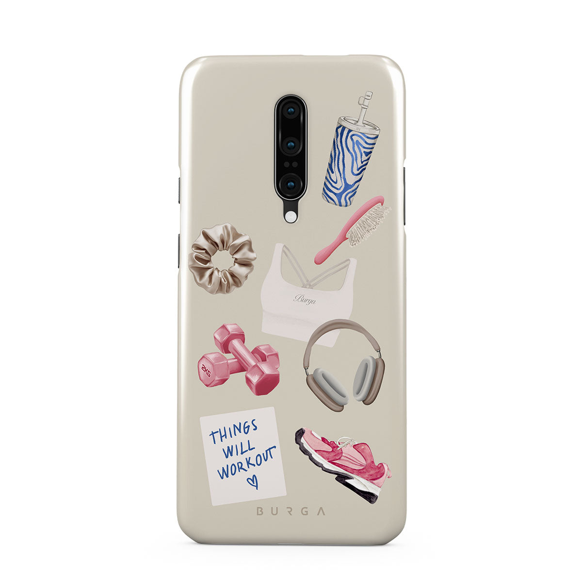 Kenmerken van dit design: dumbbells, koptelefoon, drinkbeker, haarborstel, roze sneakers, sport-bh, Crunchie-reep, sticky note "Things Will Work Out".