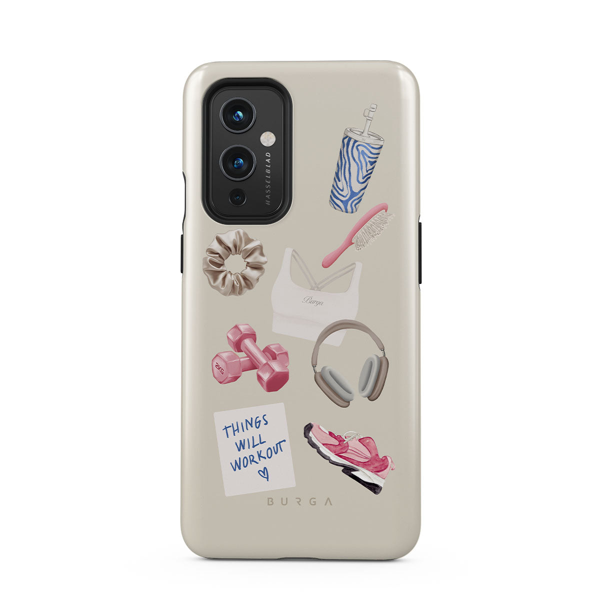 Kenmerken van dit design: dumbbells, koptelefoon, drinkbeker, haarborstel, roze sneakers, sport-bh, Crunchie-reep, sticky note "Things Will Work Out".