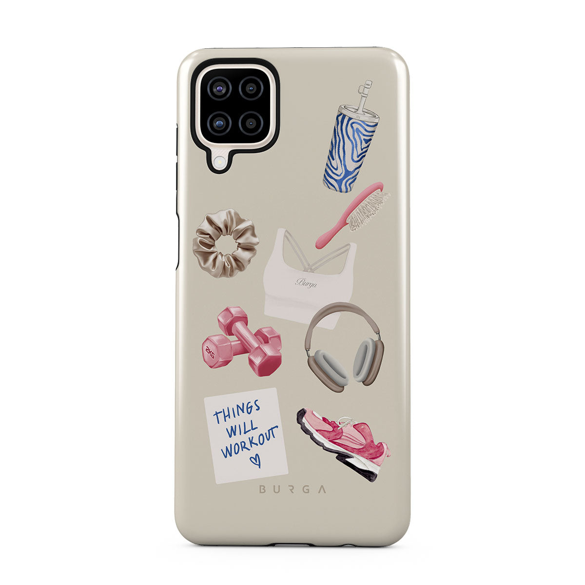Kenmerken van dit design: dumbbells, koptelefoon, drinkbeker, haarborstel, roze sneakers, sport-bh, Crunchie-reep, sticky note "Things Will Work Out".