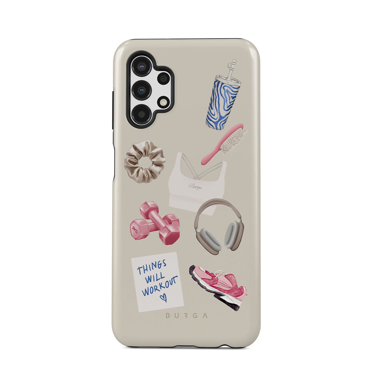 Kenmerken van dit design: dumbbells, koptelefoon, drinkbeker, haarborstel, roze sneakers, sport-bh, Crunchie-reep, sticky note "Things Will Work Out".