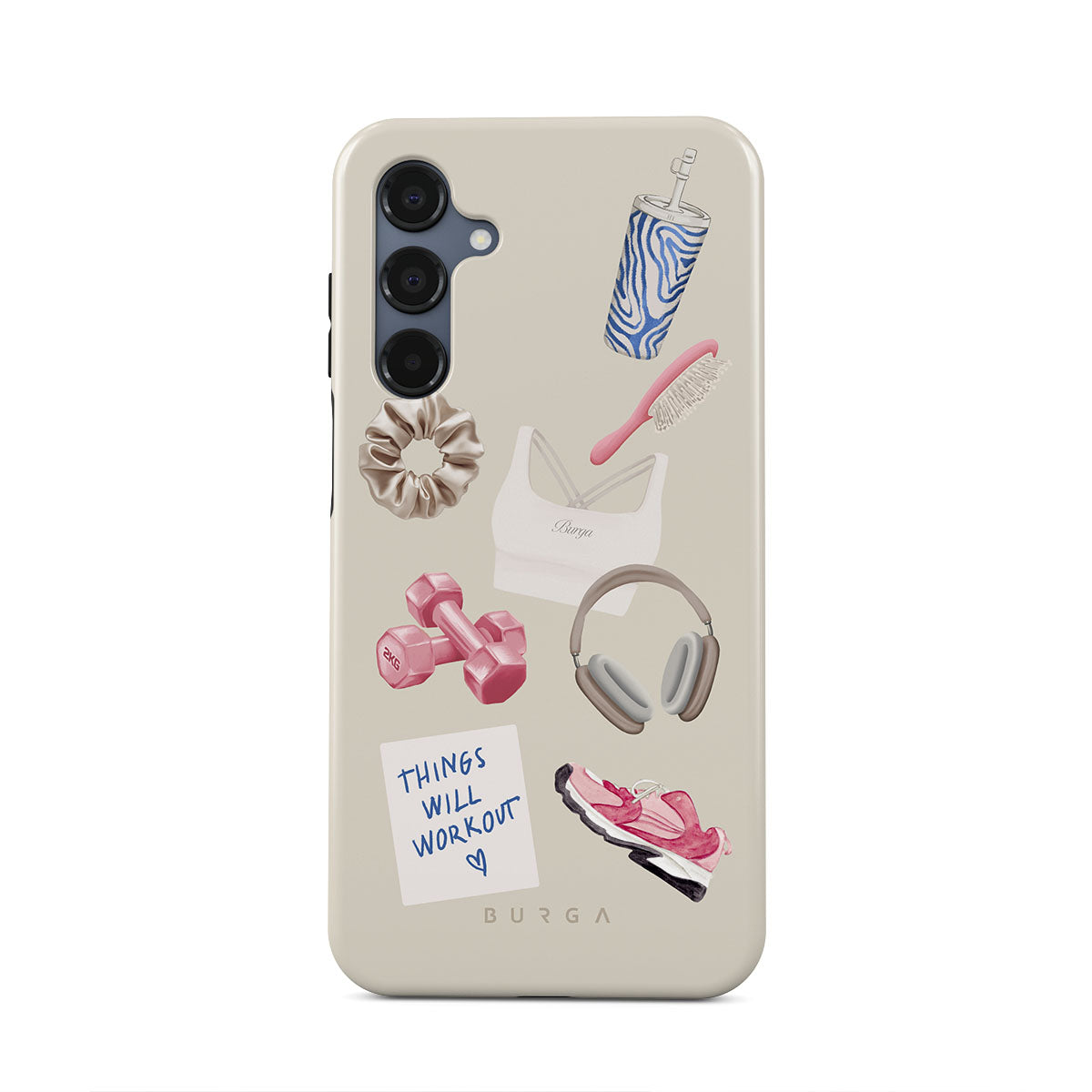 Kenmerken van dit design: dumbbells, koptelefoon, drinkbeker, haarborstel, roze sneakers, sport-bh, Crunchie-reep, sticky note "Things Will Work Out".