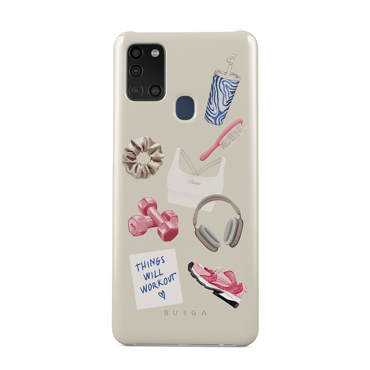 Kenmerken van dit design: dumbbells, koptelefoon, drinkbeker, haarborstel, roze sneakers, sport-bh, Crunchie-reep, sticky note "Things Will Work Out".