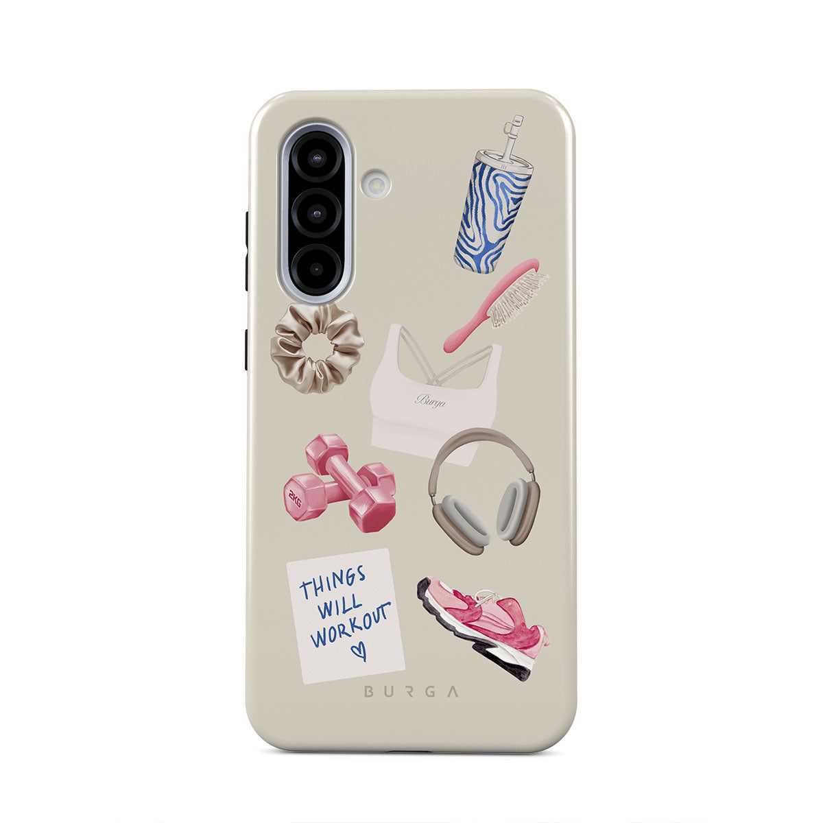 Kenmerken van dit design: dumbbells, koptelefoon, drinkbeker, haarborstel, roze sneakers, sport-bh, Crunchie-reep, sticky note "Things Will Work Out".