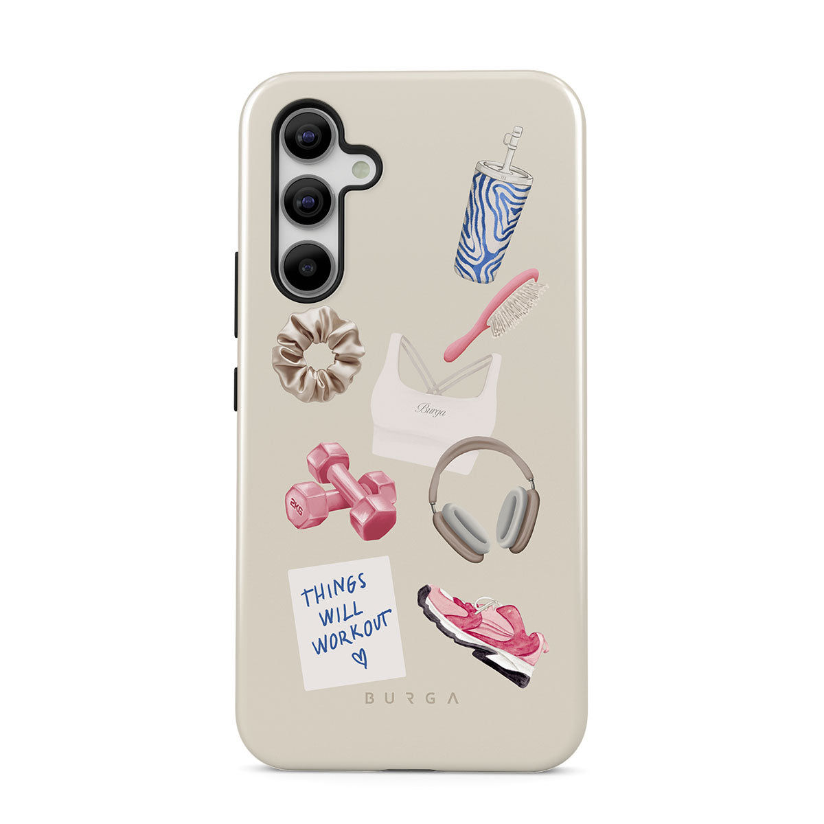 Kenmerken van dit design: dumbbells, koptelefoon, drinkbeker, haarborstel, roze sneakers, sport-bh, Crunchie-reep, sticky note "Things Will Work Out".
