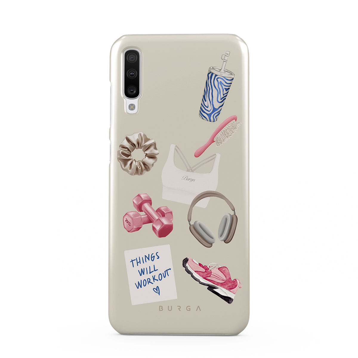 Kenmerken van dit design: dumbbells, koptelefoon, drinkbeker, haarborstel, roze sneakers, sport-bh, Crunchie-reep, sticky note "Things Will Work Out".