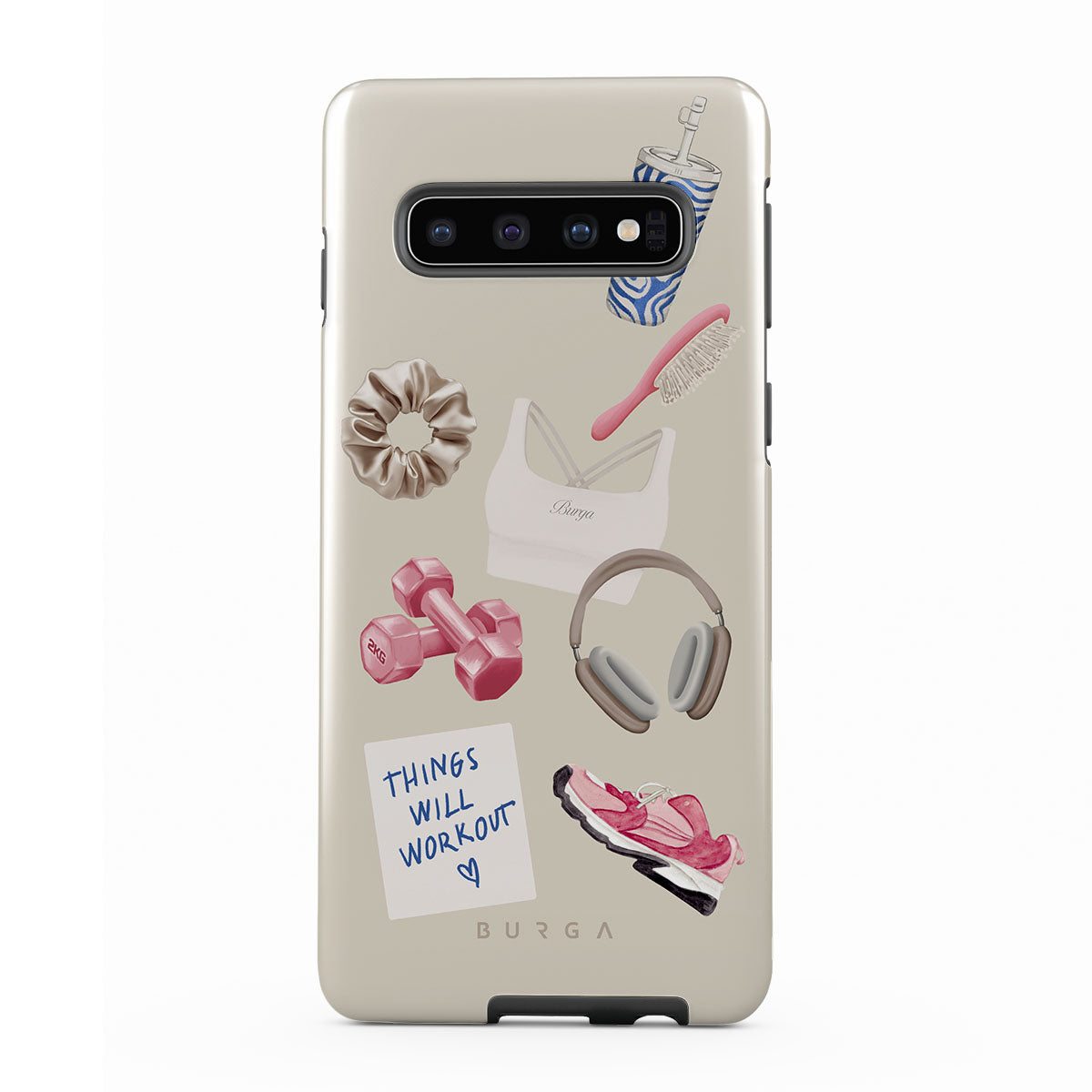 Kenmerken van dit design: dumbbells, koptelefoon, drinkbeker, haarborstel, roze sneakers, sport-bh, Crunchie-reep, sticky note "Things Will Work Out".