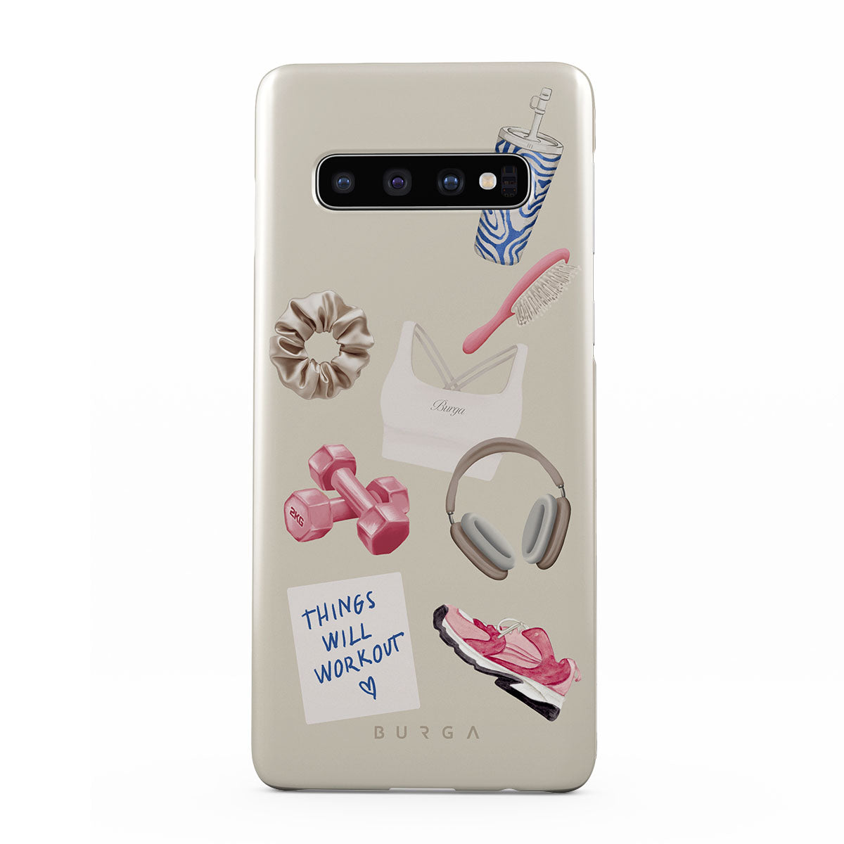 Kenmerken van dit design: dumbbells, koptelefoon, drinkbeker, haarborstel, roze sneakers, sport-bh, Crunchie-reep, sticky note "Things Will Work Out".