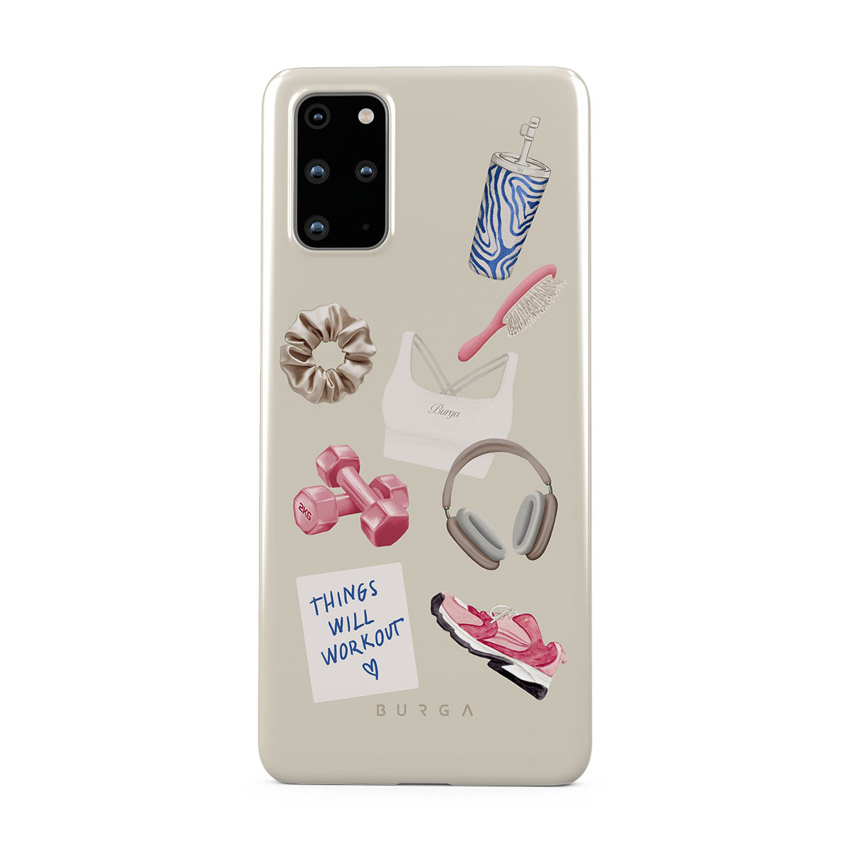 Kenmerken van dit design: dumbbells, koptelefoon, drinkbeker, haarborstel, roze sneakers, sport-bh, Crunchie-reep, sticky note "Things Will Work Out".