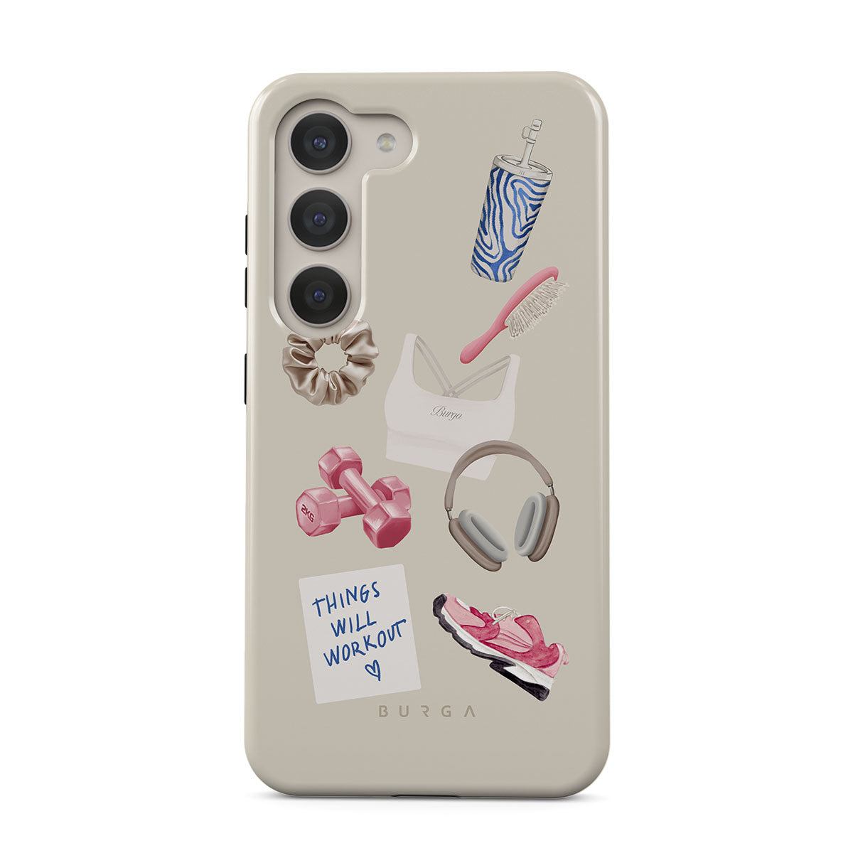 Kenmerken van dit design: dumbbells, koptelefoon, drinkbeker, haarborstel, roze sneakers, sport-bh, Crunchie-reep, sticky note "Things Will Work Out".