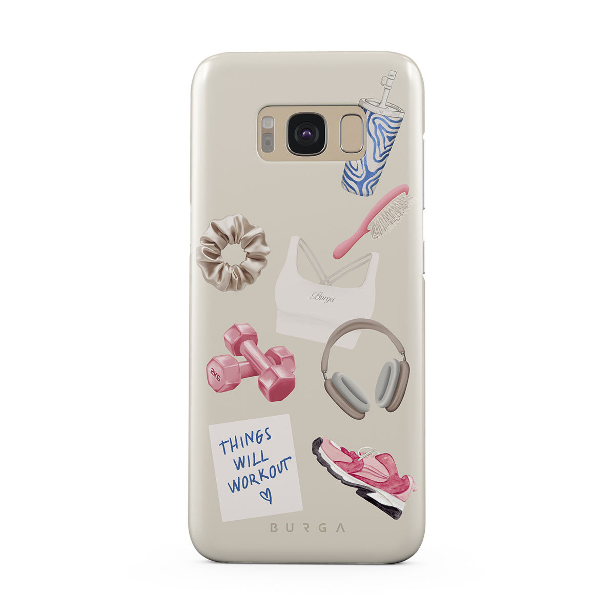 Kenmerken van dit design: dumbbells, koptelefoon, drinkbeker, haarborstel, roze sneakers, sport-bh, Crunchie-reep, sticky note "Things Will Work Out".