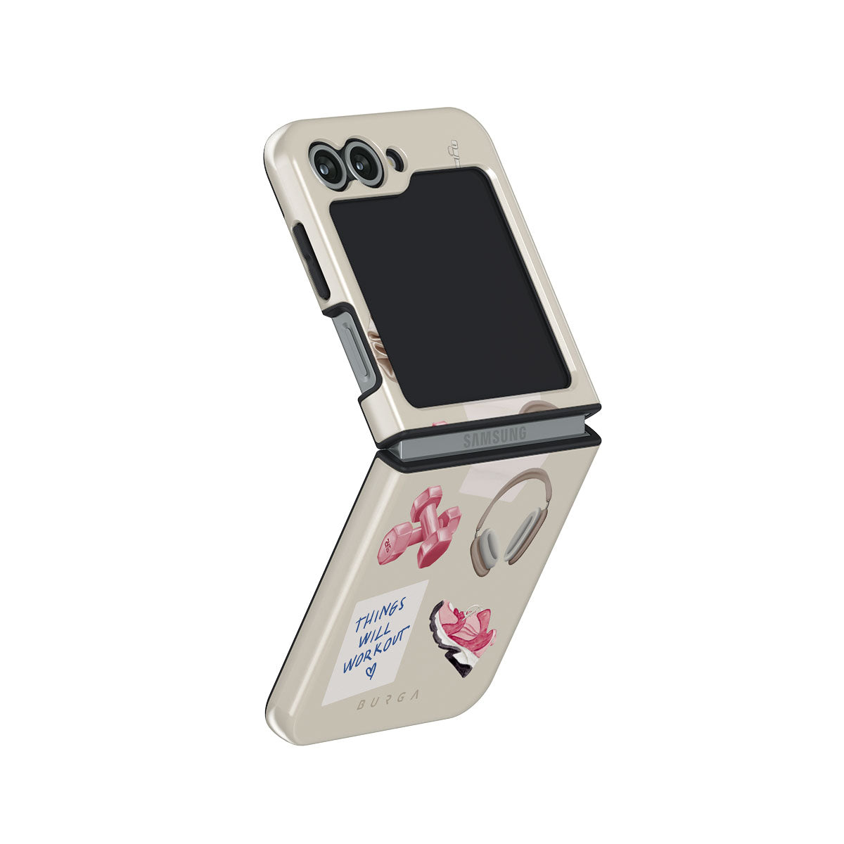 Kenmerken van dit design: dumbbells, koptelefoon, drinkbeker, haarborstel, roze sneakers, sport-bh, Crunchie-reep, sticky note "Things Will Work Out".