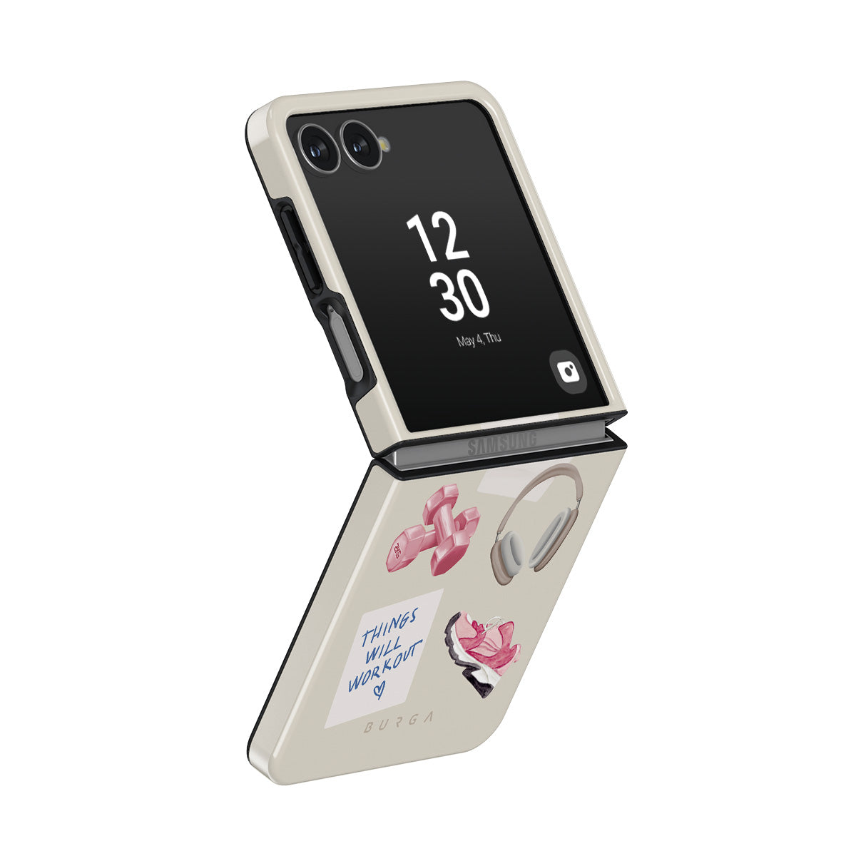 Kenmerken van dit design: dumbbells, koptelefoon, drinkbeker, haarborstel, roze sneakers, sport-bh, Crunchie-reep, sticky note "Things Will Work Out".