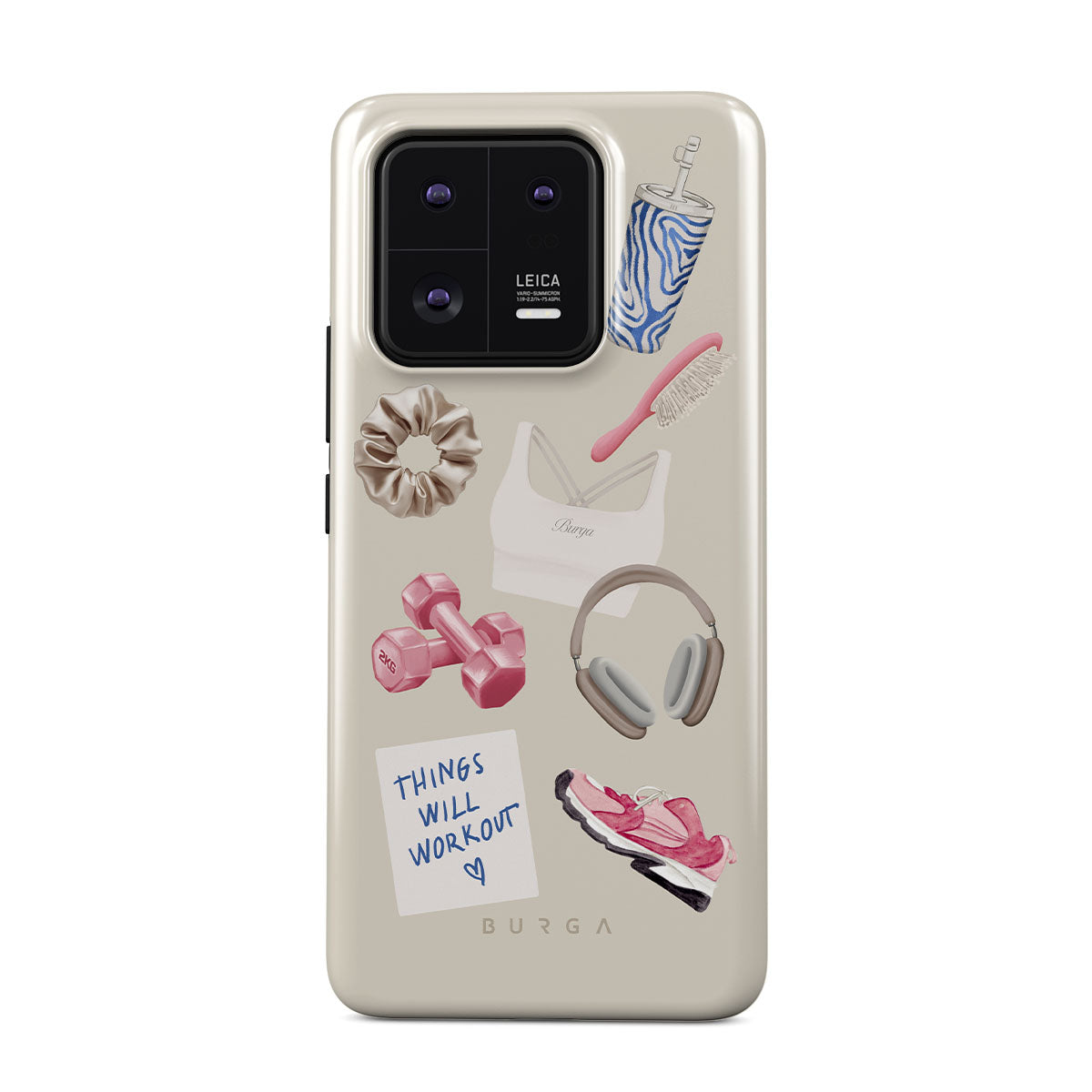 Kenmerken van dit design: dumbbells, koptelefoon, drinkbeker, haarborstel, roze sneakers, sport-bh, Crunchie-reep, sticky note "Things Will Work Out".