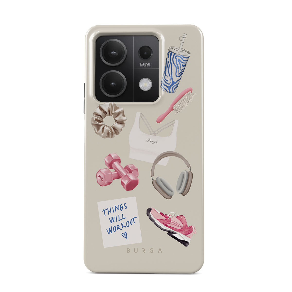 Kenmerken van dit design: dumbbells, koptelefoon, drinkbeker, haarborstel, roze sneakers, sport-bh, Crunchie-reep, sticky note "Things Will Work Out".