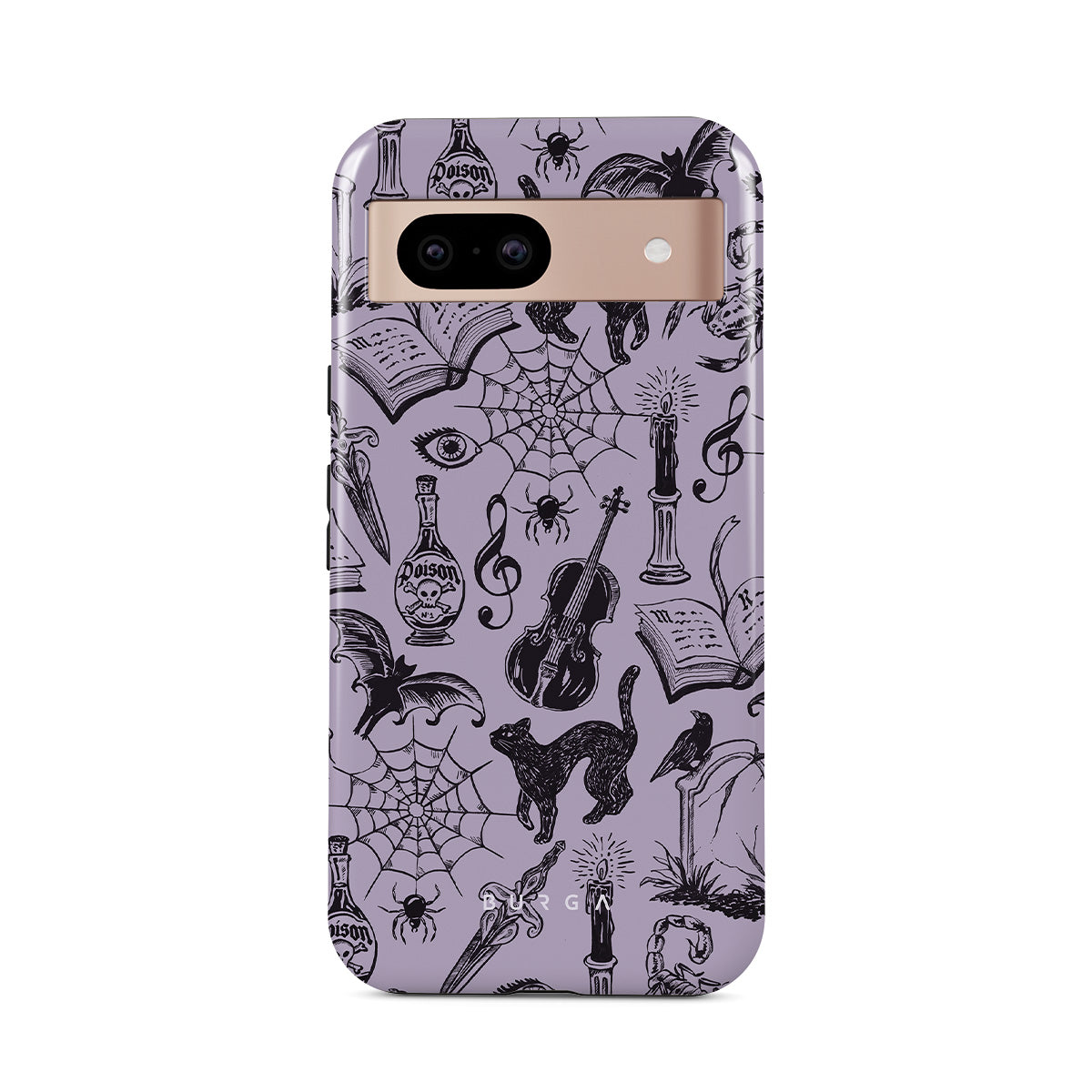 Kenmerken van dit design: gotische krabbels, mystieke elementen, spinnen, spinnenweb, kat, viool, oog, kaars, dolk, boek, vleermuis, kraai, schorpioen