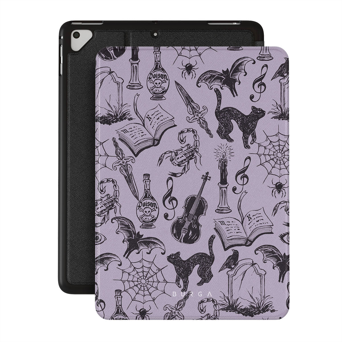 Kenmerken van dit design: gotische krabbels, mystieke elementen, spinnen, spinnenweb, kat, viool, oog, kaars, dolk, boek, vleermuis, kraai, schorpioen