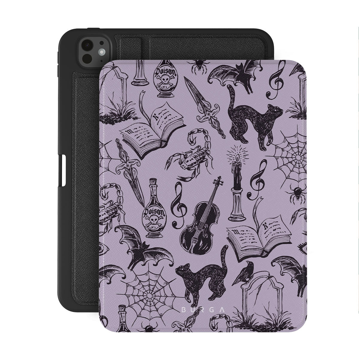 Kenmerken van dit design: gotische krabbels, mystieke elementen, spinnen, spinnenweb, kat, viool, oog, kaars, dolk, boek, vleermuis, kraai, schorpioen