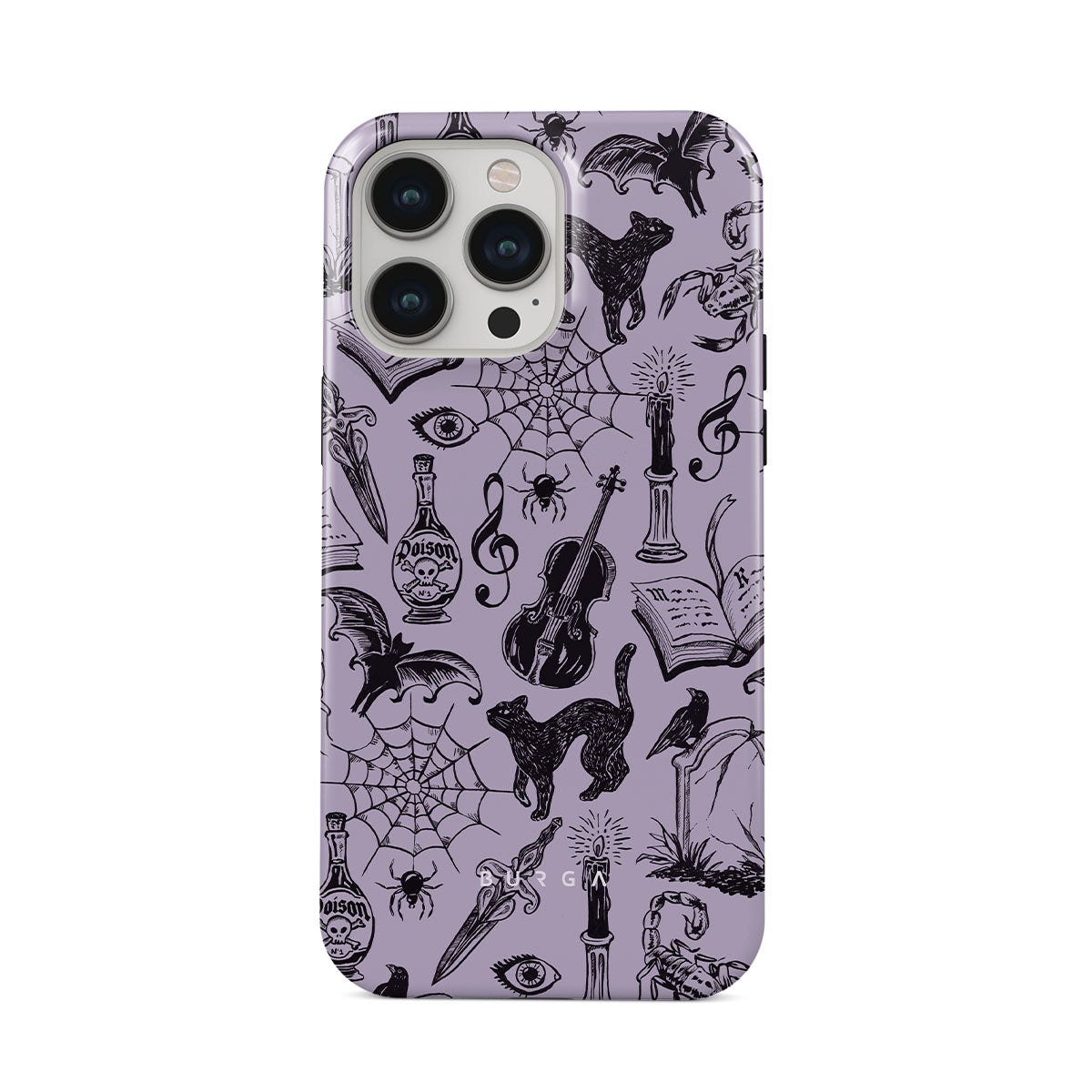 Kenmerken van dit design: gotische krabbels, mystieke elementen, spinnen, spinnenweb, kat, viool, oog, kaars, dolk, boek, vleermuis, kraai, schorpioen