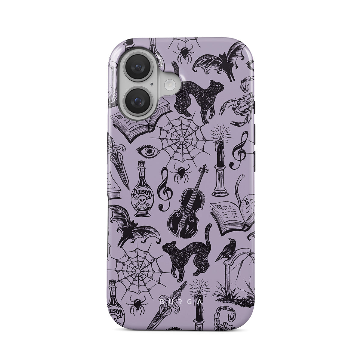 Kenmerken van dit design: gotische krabbels, mystieke elementen, spinnen, spinnenweb, kat, viool, oog, kaars, dolk, boek, vleermuis, kraai, schorpioen