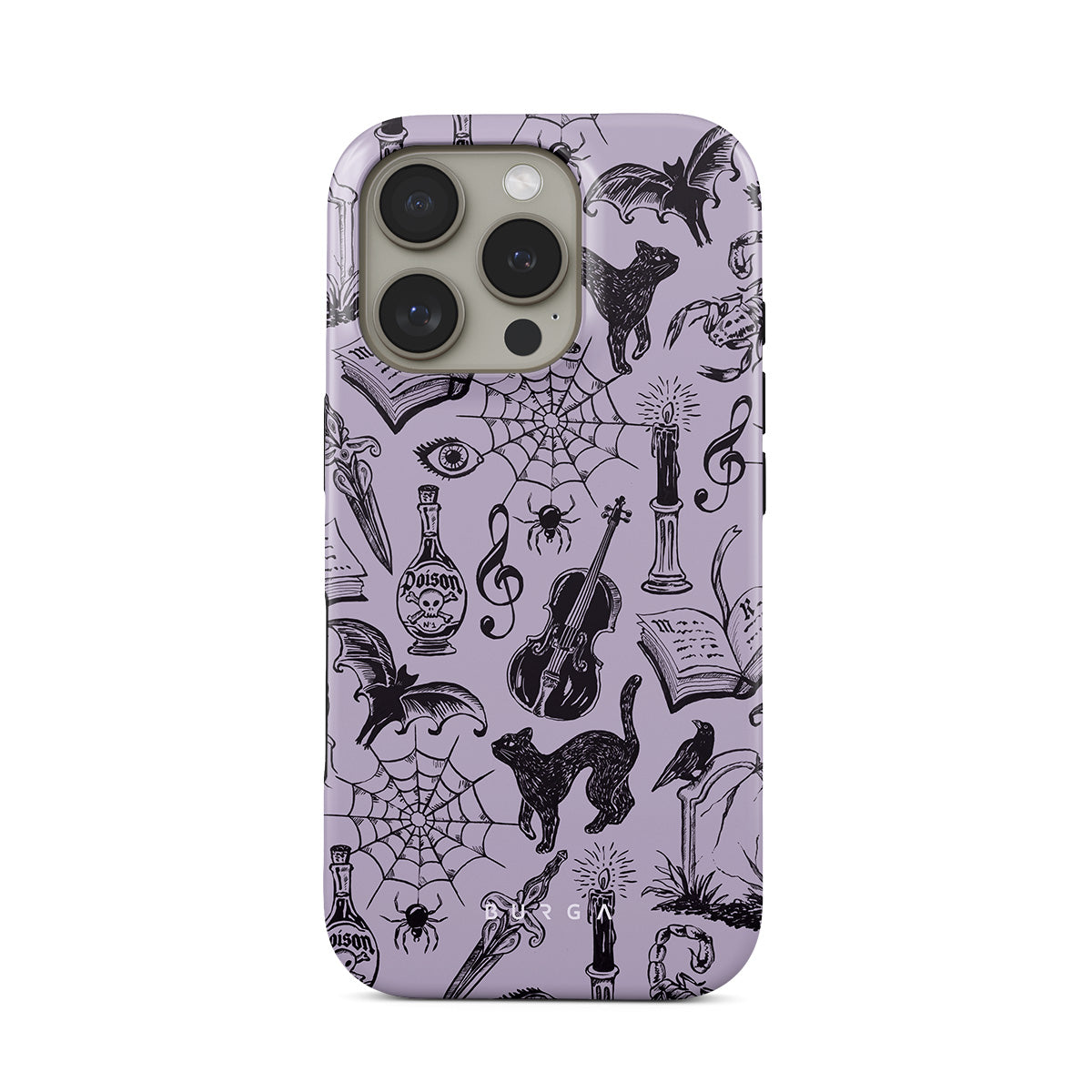 Kenmerken van dit design: gotische krabbels, mystieke elementen, spinnen, spinnenweb, kat, viool, oog, kaars, dolk, boek, vleermuis, kraai, schorpioen