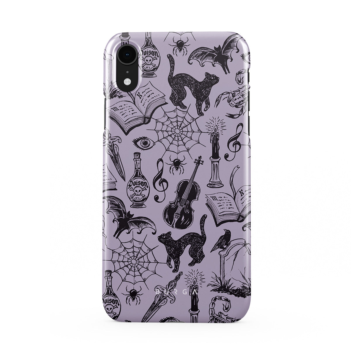 Kenmerken van dit design: gotische krabbels, mystieke elementen, spinnen, spinnenweb, kat, viool, oog, kaars, dolk, boek, vleermuis, kraai, schorpioen