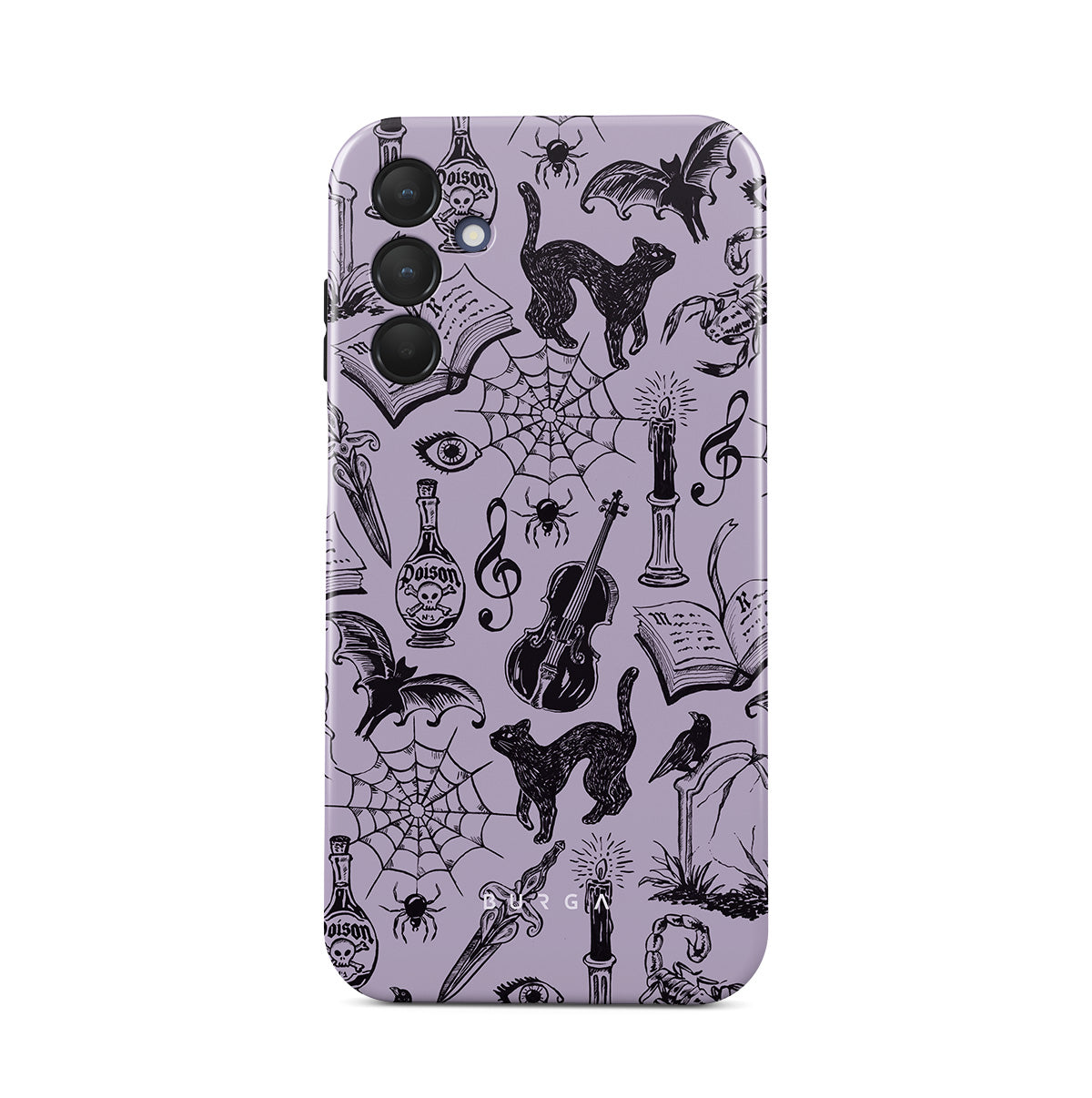 Kenmerken van dit design: gotische krabbels, mystieke elementen, spinnen, spinnenweb, kat, viool, oog, kaars, dolk, boek, vleermuis, kraai, schorpioen