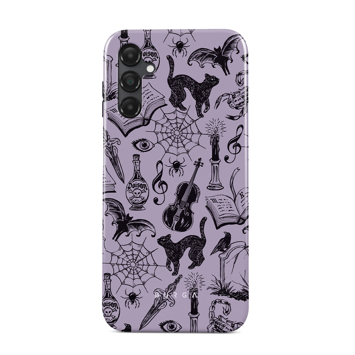 Kenmerken van dit design: gotische krabbels, mystieke elementen, spinnen, spinnenweb, kat, viool, oog, kaars, dolk, boek, vleermuis, kraai, schorpioen