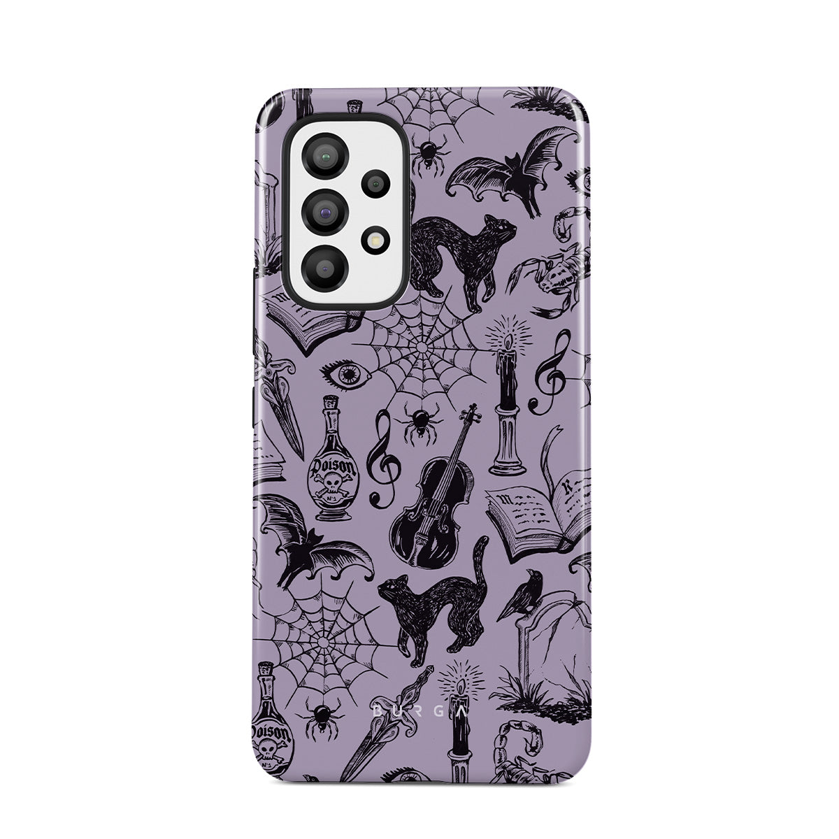 Kenmerken van dit design: gotische krabbels, mystieke elementen, spinnen, spinnenweb, kat, viool, oog, kaars, dolk, boek, vleermuis, kraai, schorpioen
