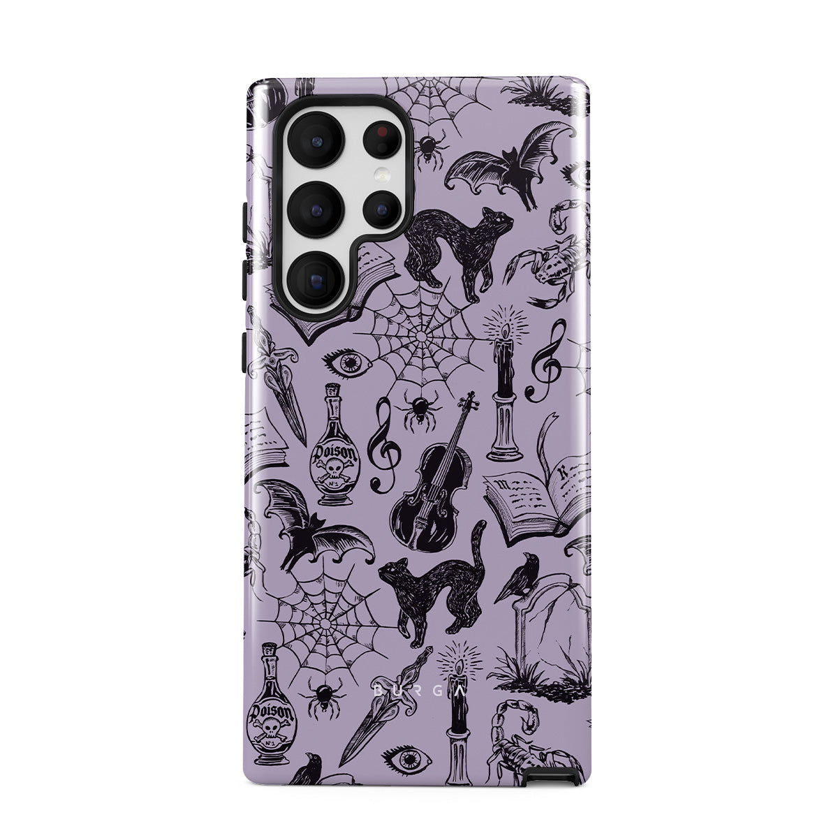 Kenmerken van dit design: gotische krabbels, mystieke elementen, spinnen, spinnenweb, kat, viool, oog, kaars, dolk, boek, vleermuis, kraai, schorpioen