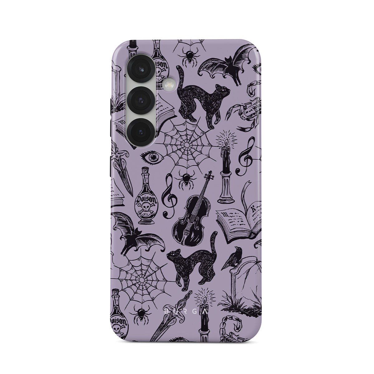 Kenmerken van dit design: gotische krabbels, mystieke elementen, spinnen, spinnenweb, kat, viool, oog, kaars, dolk, boek, vleermuis, kraai, schorpioen