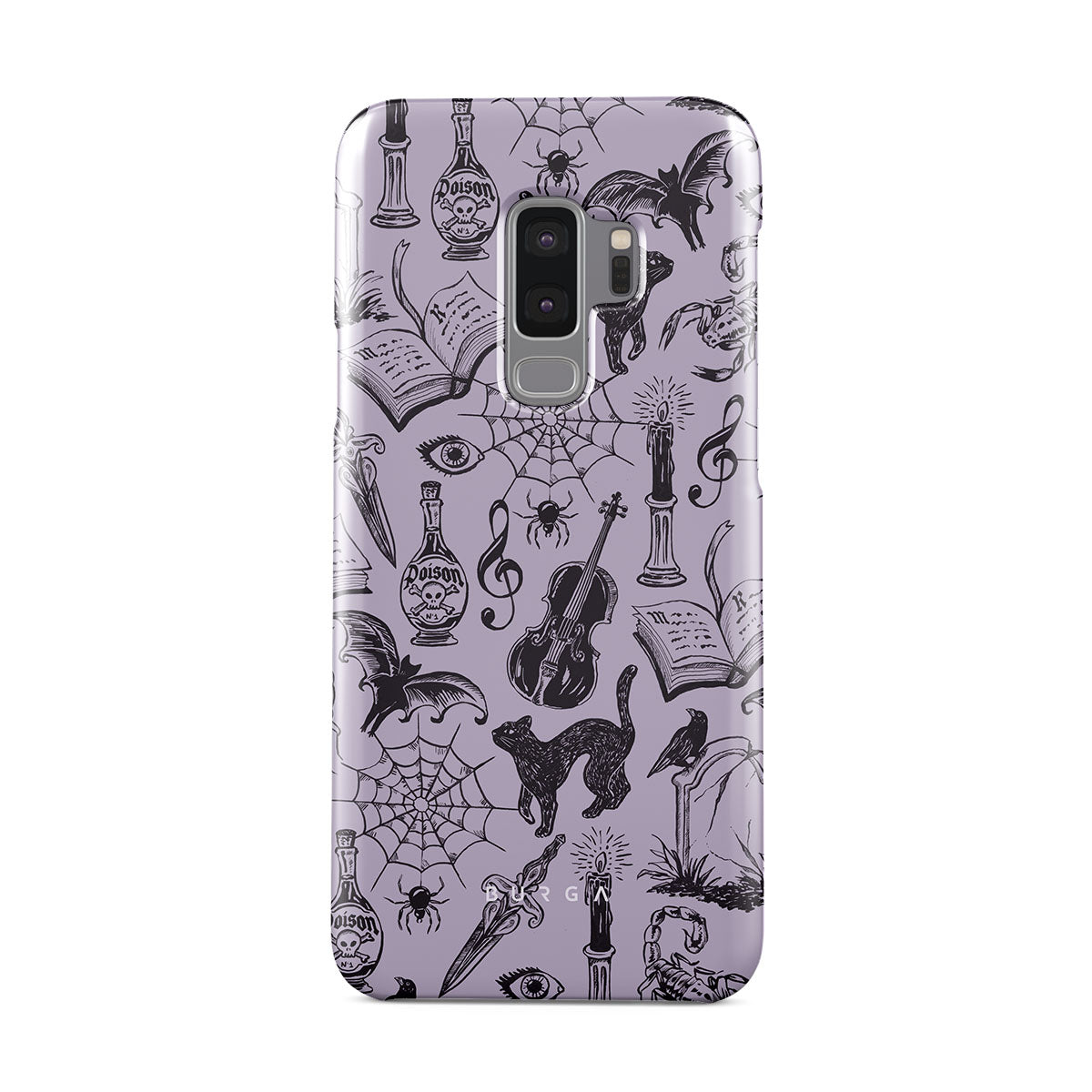 Kenmerken van dit design: gotische krabbels, mystieke elementen, spinnen, spinnenweb, kat, viool, oog, kaars, dolk, boek, vleermuis, kraai, schorpioen