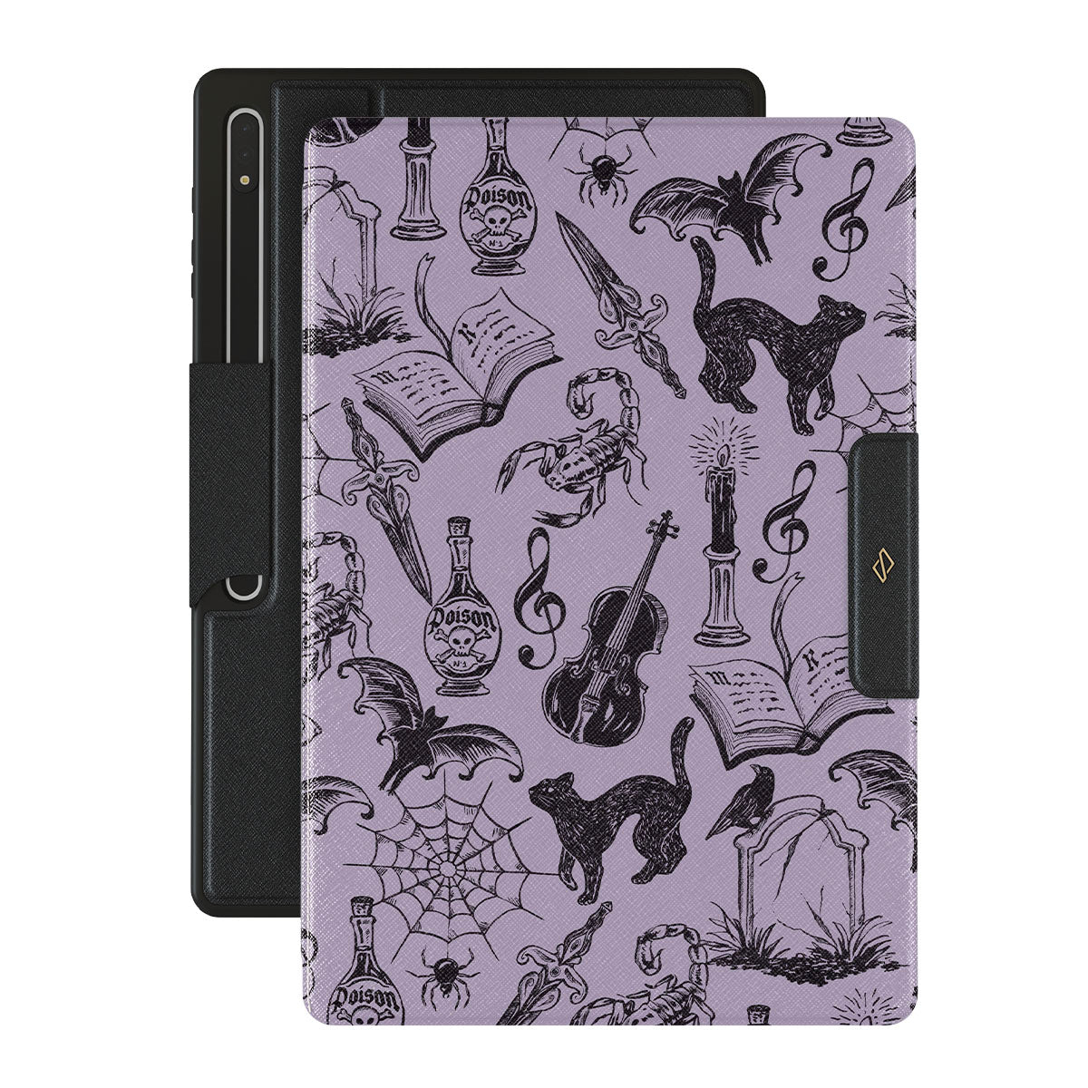 Kenmerken van dit design: gotische krabbels, mystieke elementen, spinnen, spinnenweb, kat, viool, oog, kaars, dolk, boek, vleermuis, kraai, schorpioen