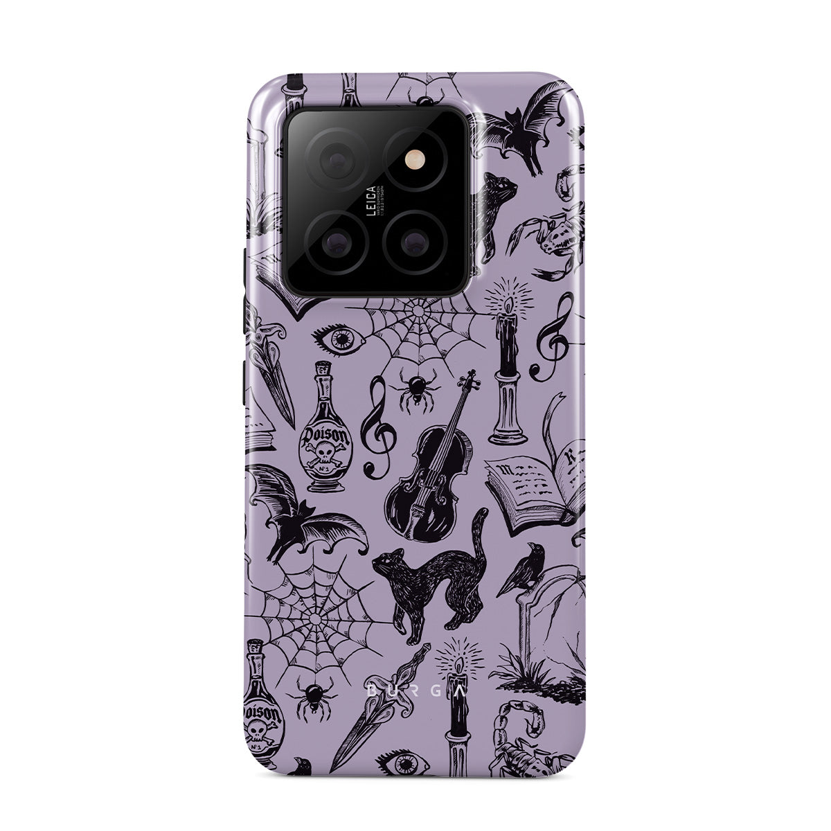 Kenmerken van dit design: gotische krabbels, mystieke elementen, spinnen, spinnenweb, kat, viool, oog, kaars, dolk, boek, vleermuis, kraai, schorpioen