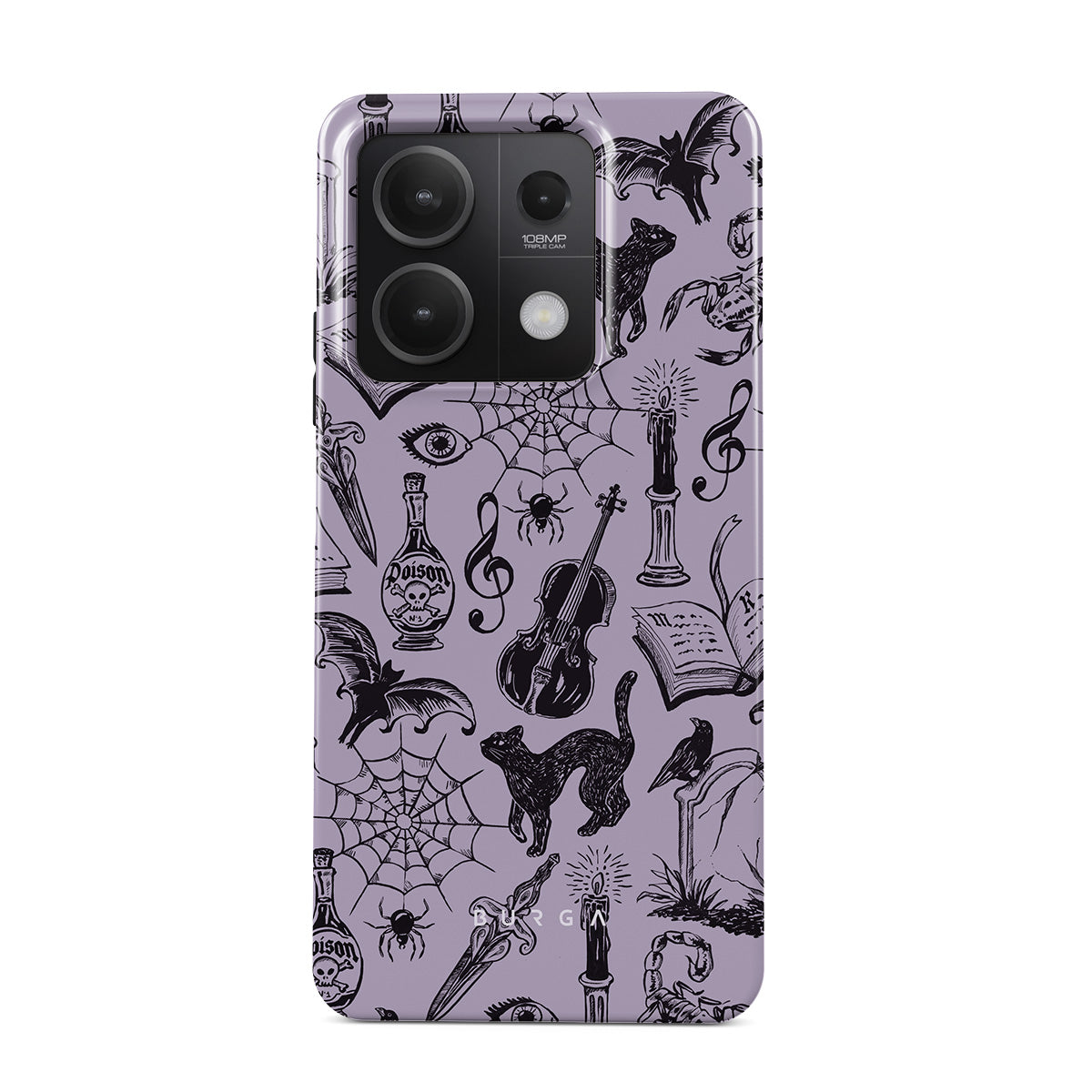 Kenmerken van dit design: gotische krabbels, mystieke elementen, spinnen, spinnenweb, kat, viool, oog, kaars, dolk, boek, vleermuis, kraai, schorpioen