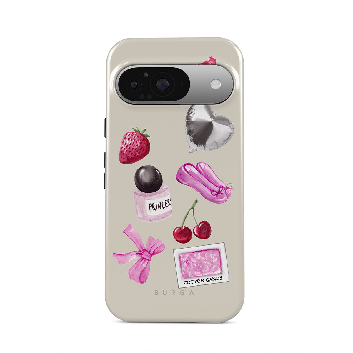 Kenmerken van dit design: roze strik, zilveren hartvormige ballon, parfumflesje, aardbei, kersen, roze balletschoenen, suikerspin-sticker, roze gummybeer.