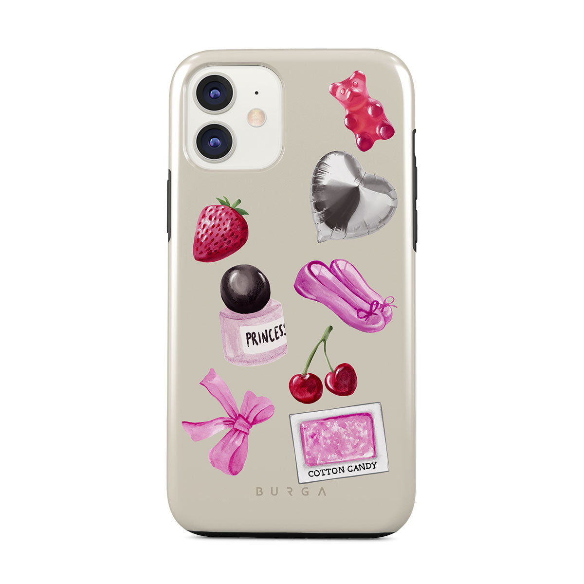 Kenmerken van dit design: roze strik, zilveren hartvormige ballon, parfumflesje, aardbei, kersen, roze balletschoenen, suikerspin-sticker, roze gummybeer.
