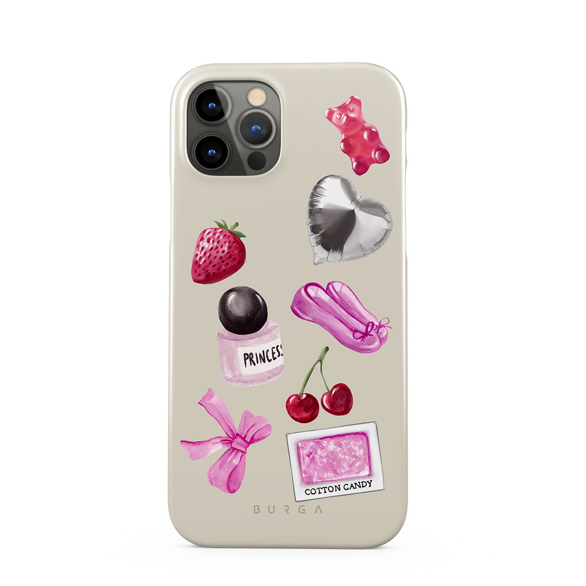 Kenmerken van dit design: roze strik, zilveren hartvormige ballon, parfumflesje, aardbei, kersen, roze balletschoenen, suikerspin-sticker, roze gummybeer.