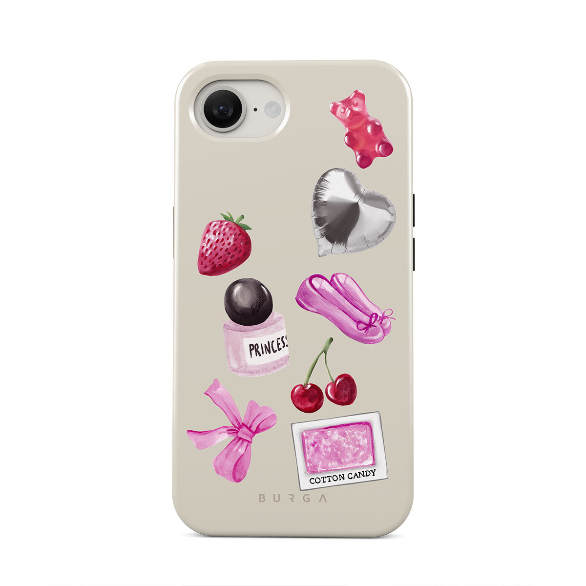 Kenmerken van dit design: roze strik, zilveren hartvormige ballon, parfumflesje, aardbei, kersen, roze balletschoenen, suikerspin-sticker, roze gummybeer.