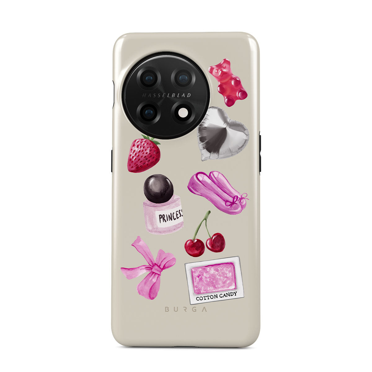 Kenmerken van dit design: roze strik, zilveren hartvormige ballon, parfumflesje, aardbei, kersen, roze balletschoenen, suikerspin-sticker, roze gummybeer.