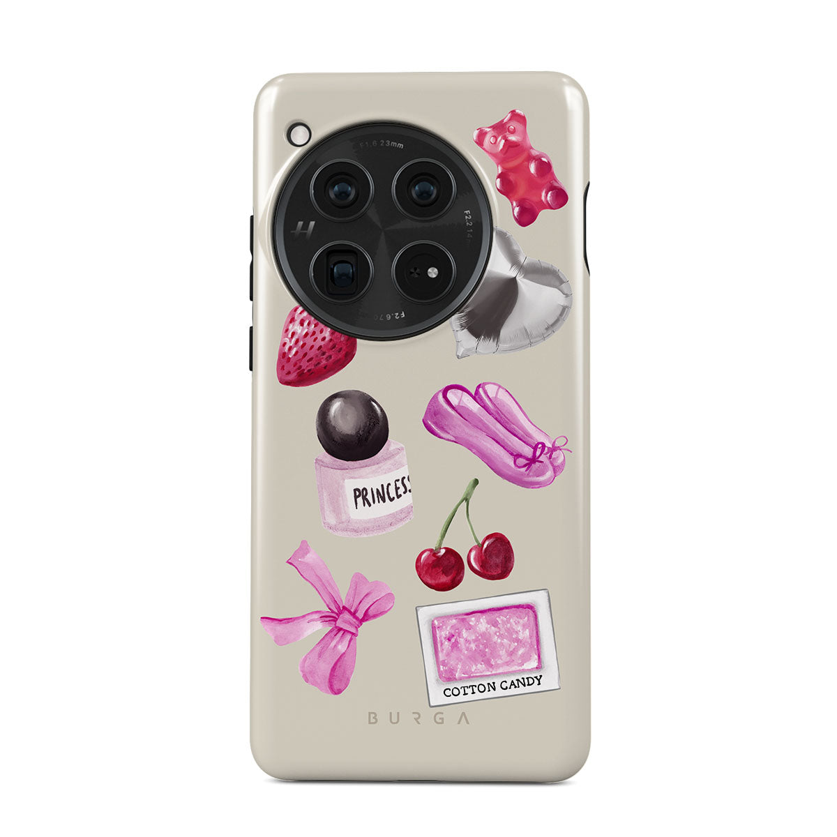 Kenmerken van dit design: roze strik, zilveren hartvormige ballon, parfumflesje, aardbei, kersen, roze balletschoenen, suikerspin-sticker, roze gummybeer.