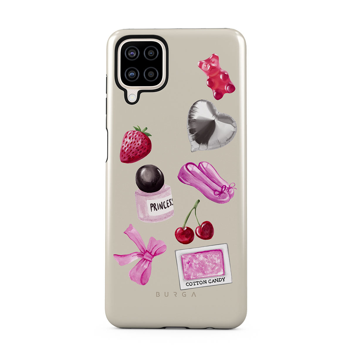 Kenmerken van dit design: roze strik, zilveren hartvormige ballon, parfumflesje, aardbei, kersen, roze balletschoenen, suikerspin-sticker, roze gummybeer.